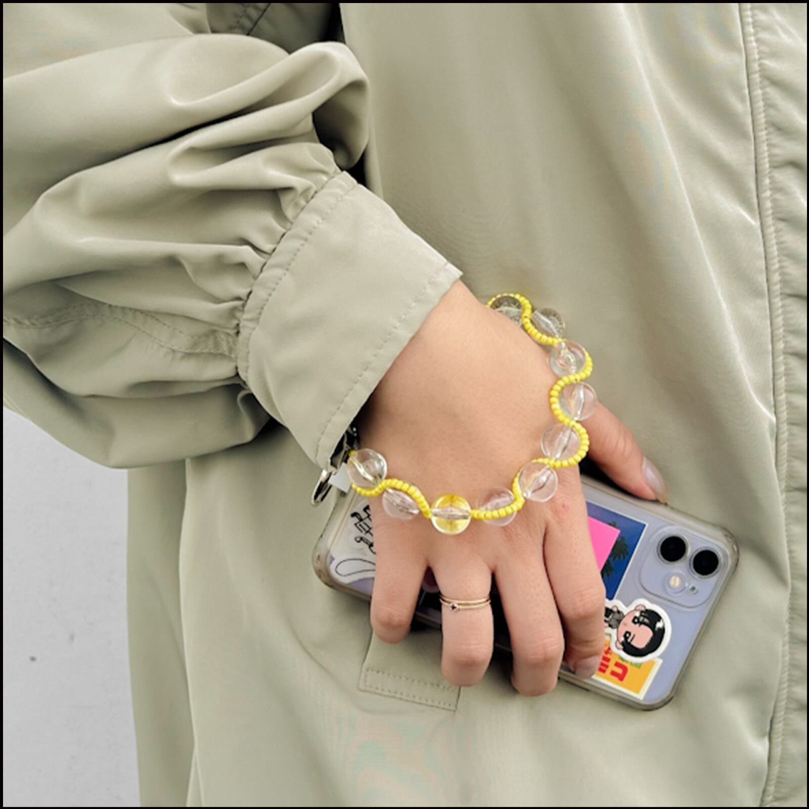 ・スマホを持ち歩くときも、このストラップを付けていると手元が華やかに見え、お洒落な印象に。